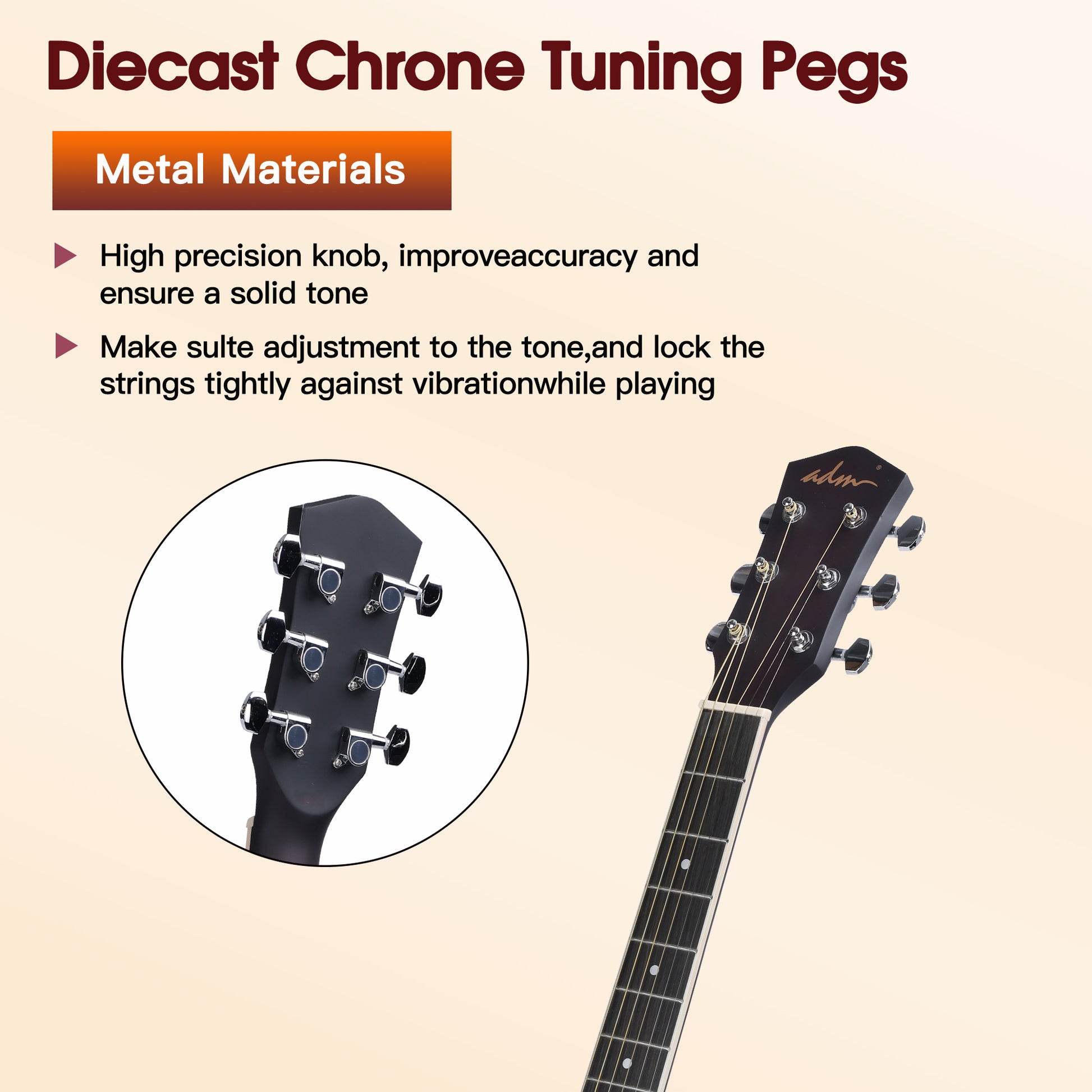 - STAY IN TUNE: Constructed with high quality alloy metal made tuning machine, phosphor bronze strings with high carbon steel hex core, high hardness bridge saddle and bone nut. 20 Brass Frets with Fret position Marks at 3th, 5th, 7th, 9th, 12th, 15th and 17th frets on neck and top of fingerboard. ADM acoustic guitar is easy to tune and hold tune after a few times tune-up of strings