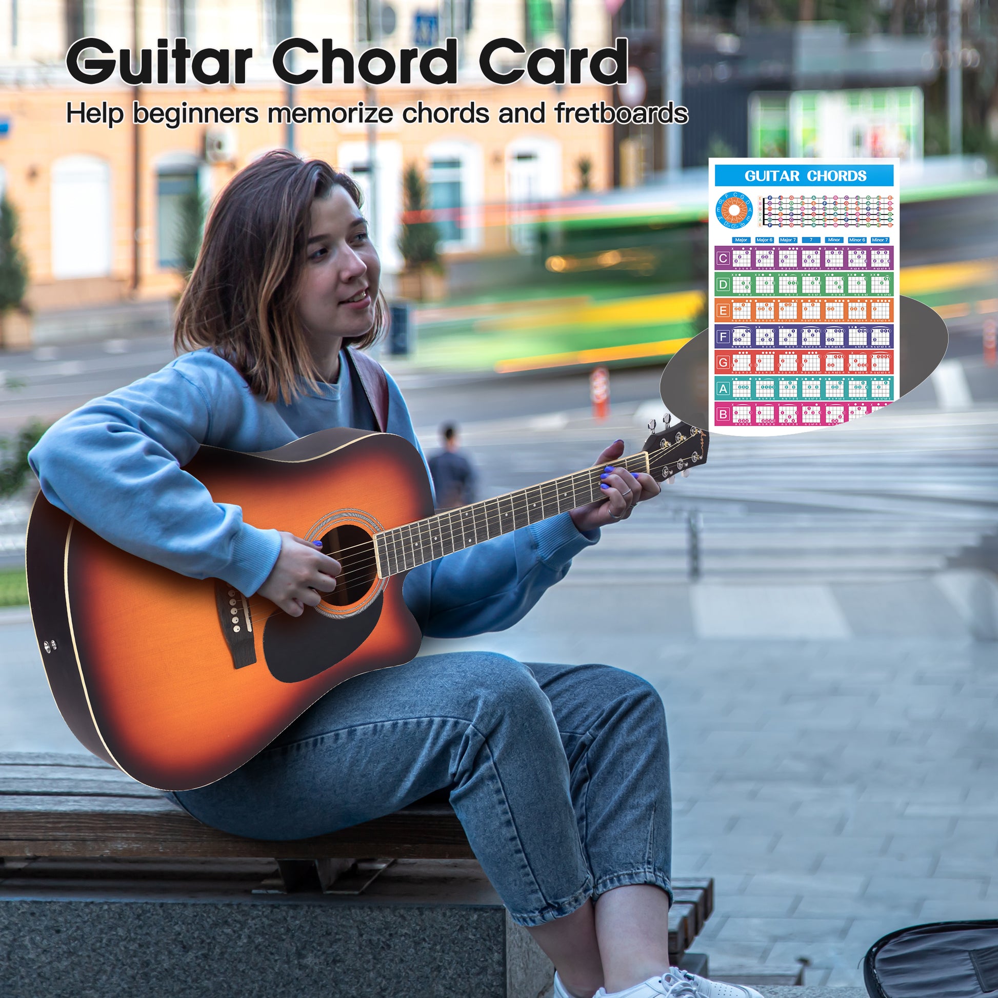 - MOST COMPLETE BEGINNER GUITAR SET & FREE LESSON - The ultimate starter kit for a budding musician, this right-handed 41-inch dreadnought cutaway acoustic classical guitar starter kit comes with novice essential accessories. It comes with a waterproof padded gig bag, digital tuner(battery not included), extra strings, strap, picks, capo, guitar hanger or stand(Alternate between new and old stock), music stand, storage bag, guitar chord card and Free Start Lessons Card etc