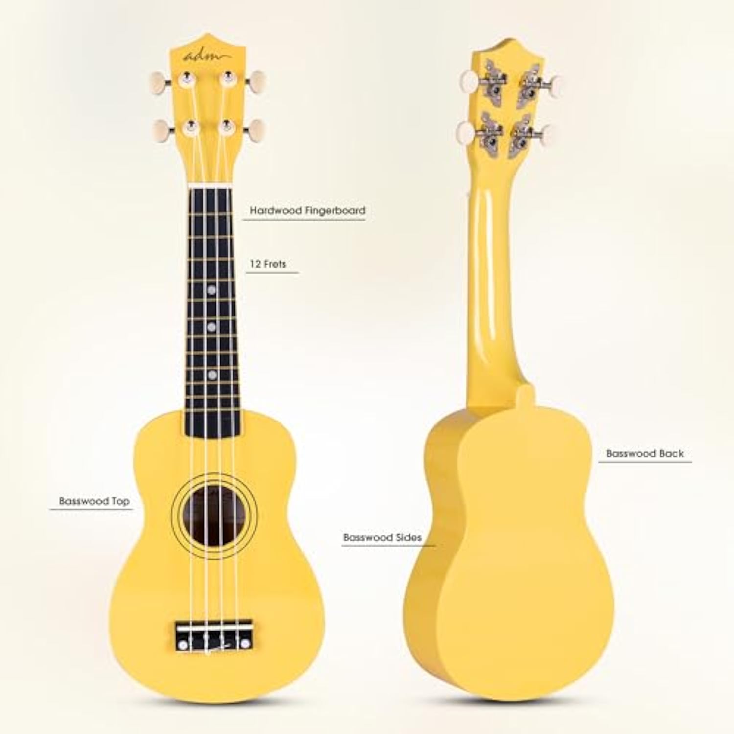 - ♫【SUPERIOR-QUALITY CRAFTSMANSHIP】ADM Soprano 21" ukulele are made of high-quality solid basswood which offers a bright and distinctive tone whether you solo, play along or singing with friends. Highly polished smooth nylon strings with elevated resistance to wear under tension and the eco-friendly design make it your favorite musical instrument
